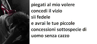 "Prima di tutto, pensi davvero di aver pagato per il ritardo? apri il portafoglio e inizia a pompare subito o ti lascio qui con il cazzo molle. Sì, proprio così sei mio, il tuo corpo è mio la tua mente è mia e il tuo denaro è mio. Dimmi 'Sì Padrona, le dono tutto, mentre ti inginocchi. Ora, spogliati piano. Fammi vedere quel cazzetto ridicolo che hai. non toccarlo ancora frocio. È mio e lo comando io."